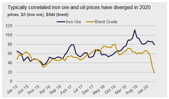 Oil prices play an important role in steel costs, particularly through raw materials prices. We see a strong correlation between the oil price and the iron ore price over long periods of time (e.g. through the super cycle since the ’90s). There are a range of reasons for this, some are very direct in nature, and some indirect. A significant proportion of iron ore production costs are directly linked to oil prices (e.g. diesel for mining trucks and fuel oil for shipping), while other components of mining costs are partly linked to oil (e.g. consumables that need to be transported to site, which needs oil, or electricity which has some correlation to oil due to energy substitution).
