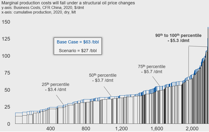 For metallurgical coal, prices tend be informed by the 90th percentile of the Business Cost curve over the medium-term. A fall in the Brent crude oil price fall of $38/bbl results in a $6/t reduction in the 90th percentile of the metallurgical coal Business Cost curve. It is important to note that many Chinese mines sit near the 90th percentile and as Chinese oil prices are set annually by the Chinese government, their costs are less responsive to changes in international prices.