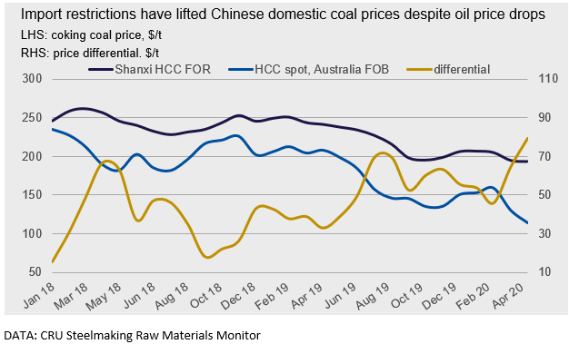 We have also not seen the immediate or full translation into domestic Chinese conditions from the weak seaborne market (i.e.) the import arbitrage is not closing due to Chinese import restrictions (even though Chinese imports were strong YTD April). This in turn is meaning that Chinese steel mills are currently facing higher domestically sourced fuel costs relative to their competitors outside of China.