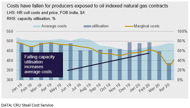 Consider India, a country where natural gas prices are indexed against Brent crude prices. India’s marginal steel producers play an important role as swing suppliers to regional export markets like South East Asia, and these marginal producers rely heavily on natural gas. As a result of oil price and resultant natural gas price falls, these producers are benefitting from reduced variable costs, allowing them to remain more competitive than usual in Asian export markets, which we observe to be weighing heavily on export steel prices in the region.