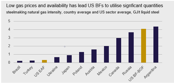 For U.S. producers, the extent to which costs will fall varies considerably between BF-BOF and EAF. BF-BOF steel producers in the U.S. utilize higher amounts of natural gas on a per tonne basis compared to U.S. EAFs but also other steelmaking operations globally. The natural gas intensity of steel produced in the U.S. via the BF-BOF route is some of the highest in the world and this is primarily due to the widespread practice of injecting natural gas via the tuyeres into blast furnaces, a practice which is economical in limited countries. Due to the higher natural gas intensity of U.S. BF-BOF producers, their costs would fall further than their EAF counterparts when natural gas prices fall.
