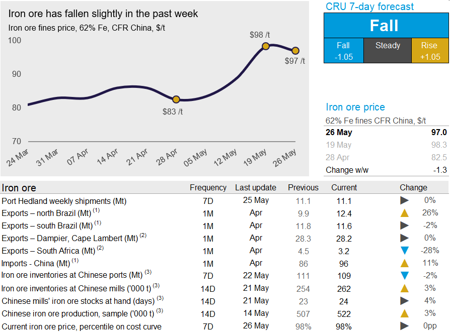 Iron ore prices contracted in the past week as China’s “Two Sessions” concluded with a disappointing outlook while Brazilian exports registered their strongest week of the year. On Tuesday, May 26, CRU assessed the 62% Fe fines price at $97.0, a $1.3 /t decrease w/w.