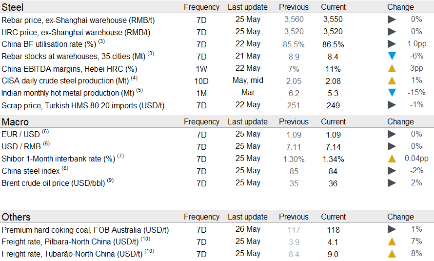 Chinese steel prices fell after the “Two Sessions” last week. No GDP growth target was announced and the sentiment in the steel market has shifted following the announcement. Although stimulus measures targeting infrastructure were announced, much of the spending will be investment in high-tech infrastructure that is less steel intensive. Other measures include an increase in quotas for government special bonds and reduced tax rates. Meanwhile, China’s steel mills continue to operate their BFs at elevated rates while steel inventories, although declining, remain elevated.