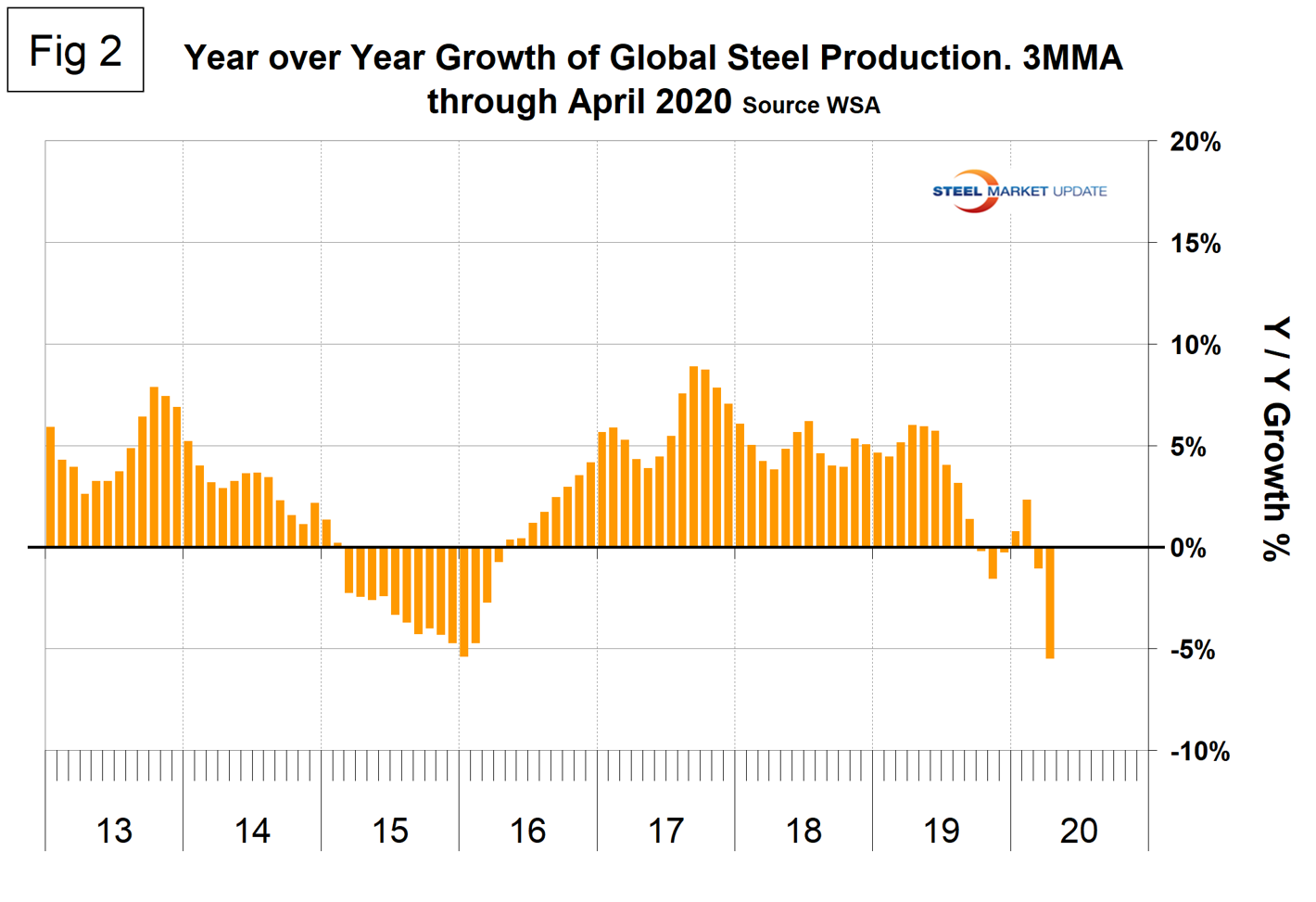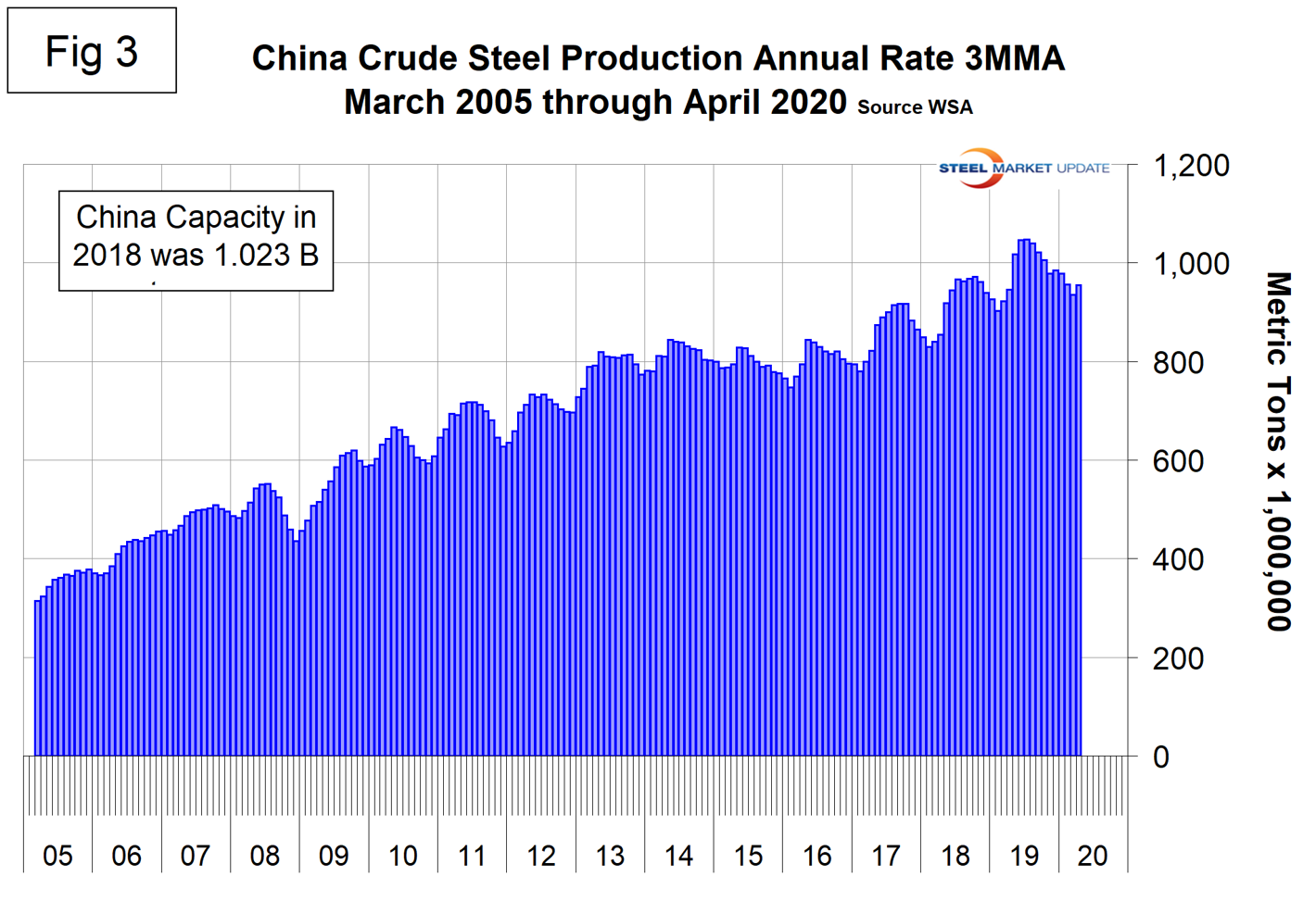 Figure 1 shows annualized monthly global steel production on a three-month moving average (3MMA) basis and capacity utilization since January 2000. Based on OECD data (see below), capacity utilization in April on a 3MMA basis was 76.8 percent. On a tons-per-day basis, production in April was 4.570 million metric tons, down from last June’s all-time high of 5.316 million metric tons.