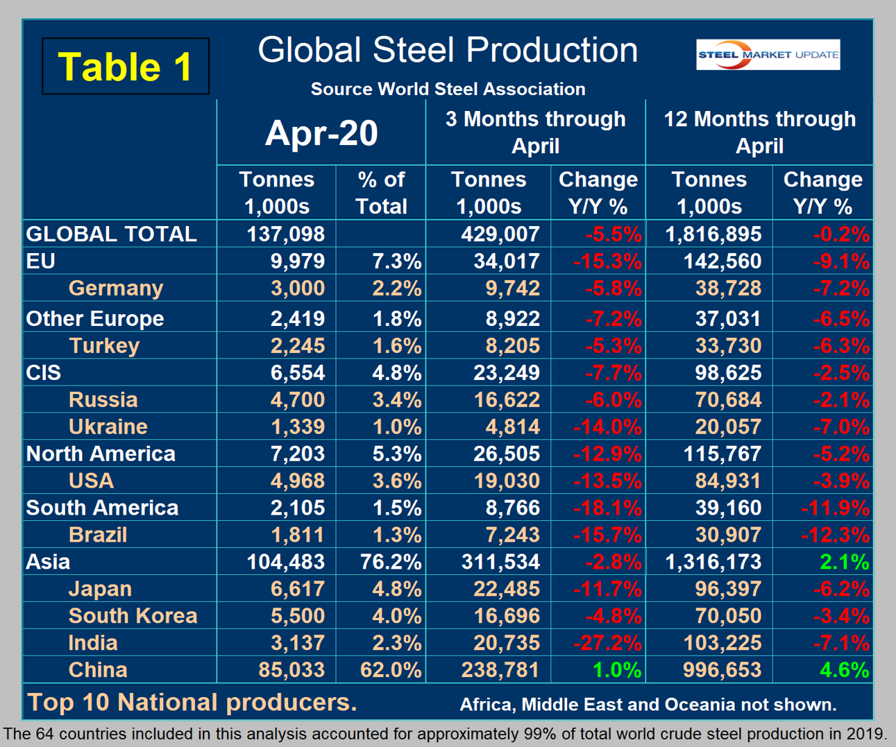 Global steel production in April, excluding China, was hit hard by the coronavirus pandemic. But by April, China was two months into a recovery. China produced a record 62 percent of total global steel production last month. Chinese steel production relative to the rest of the world is likely to become even stronger in the next few months as other nations struggle to restart their economies.
