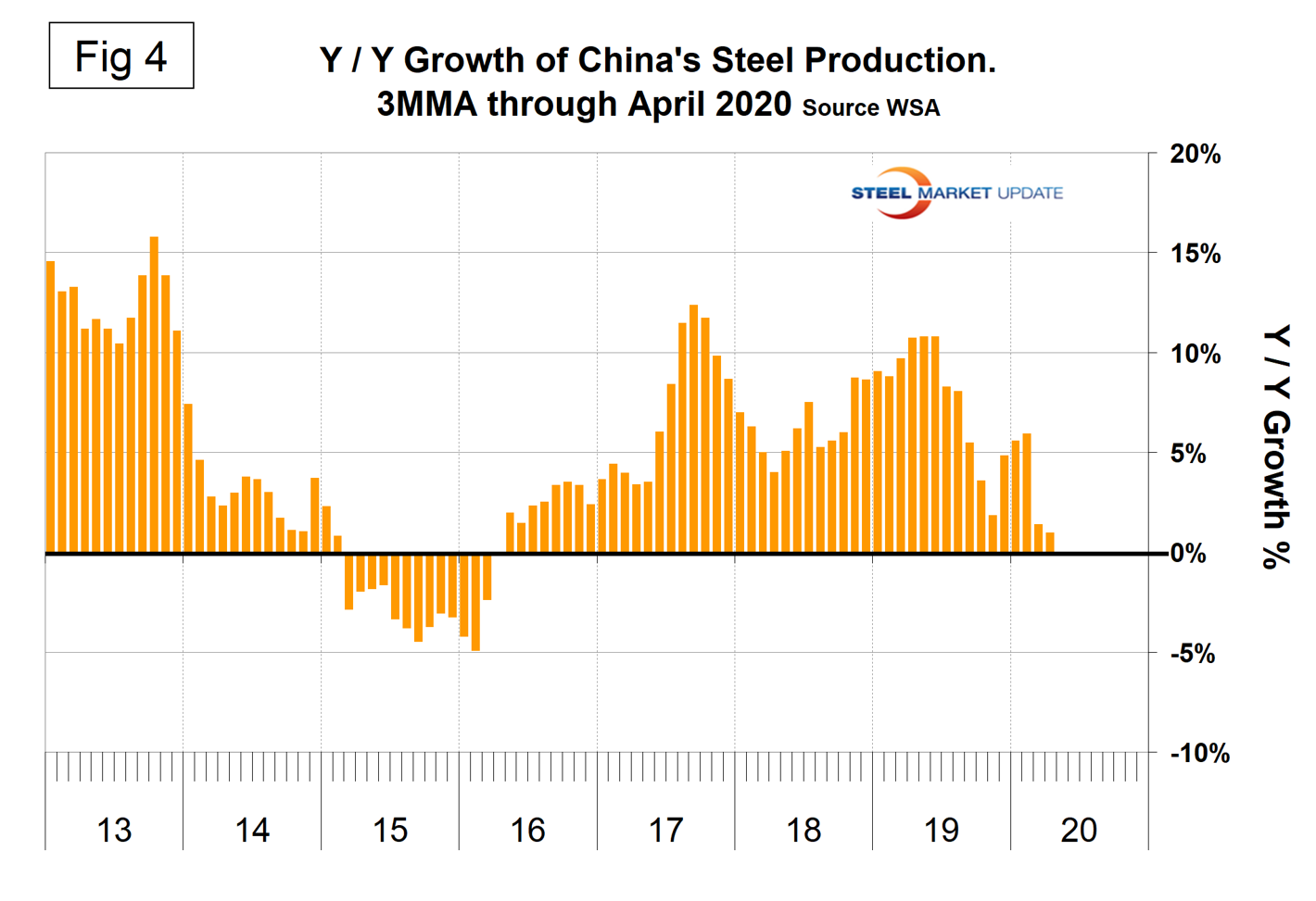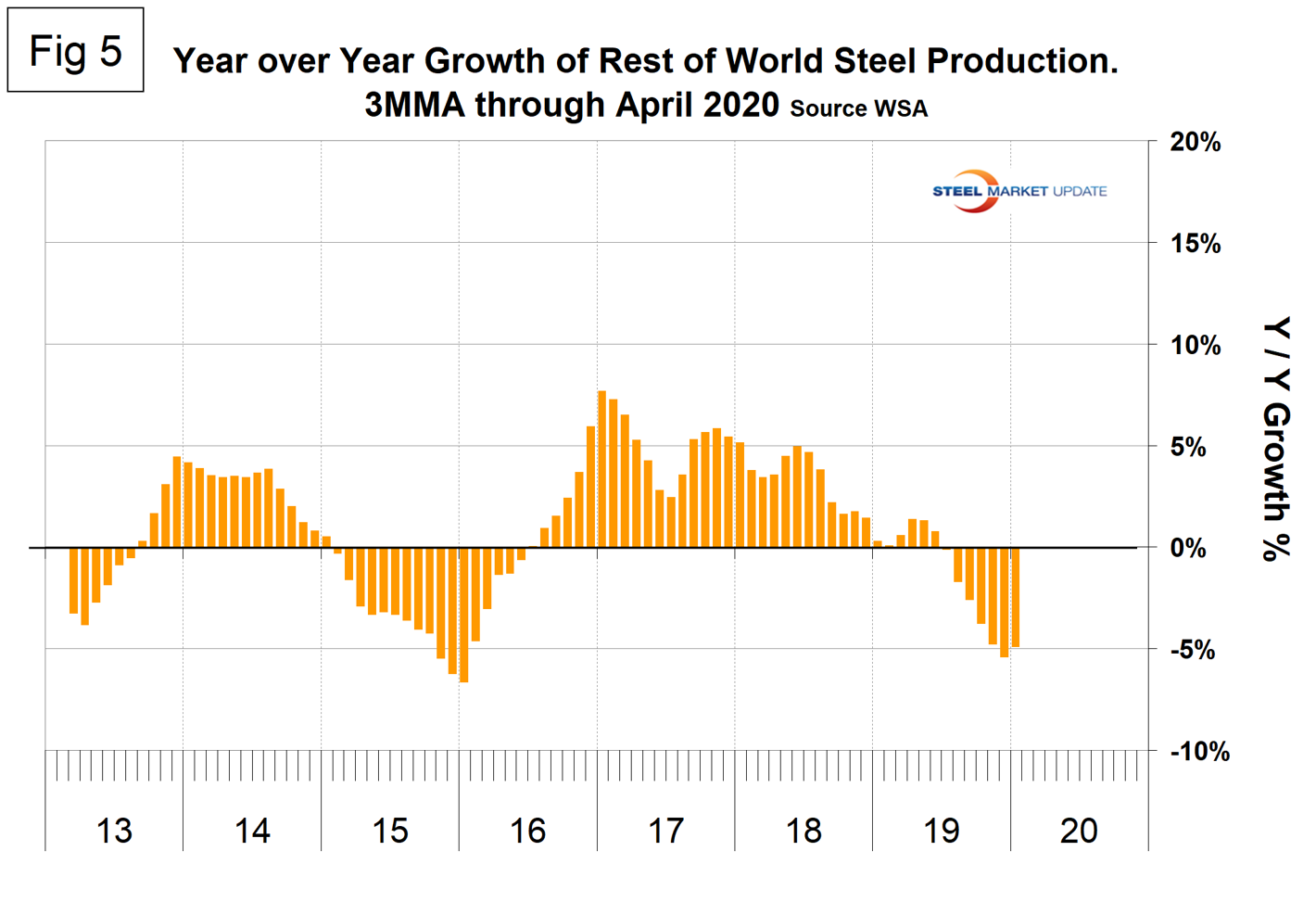 Figure 3 shows China’s production since 2005 on a 3MMA basis. In the single month of February, China’s steel production declined by 6.5 percent from January, but bounced back by 5.6 percent in March and by 7.7 percent in April. The rest of the world had a delayed reaction to the pandemic situation in China. In April, steel production in the rest of the world declined by 23.8 percent from March.