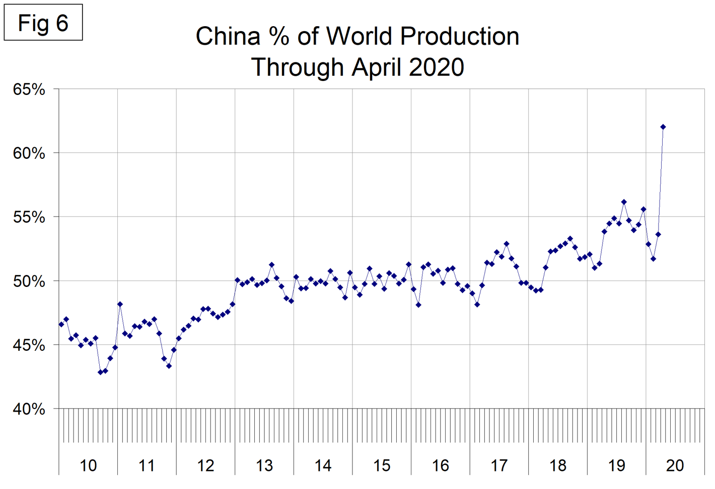 Figure 6 shows the growth of China’s share of global steel production, which was 62 percent in April, surprisingly an all-time high. To confirm, China’s total of 85,033,000 tons was 62 percent of the global total of 137,098,000 tons.