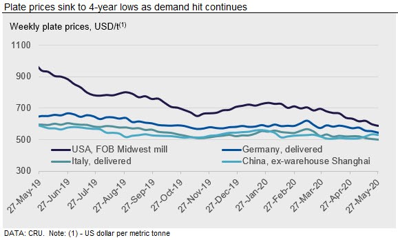 The resumption rate of European businesses has increased and construction works are taking place again. Even so, mills and service centers are still delivering orders that were placed before the lockdown and any spot orders are for small packages. There is little visibility of forward orders and what demand will look like beyond five to six weeks. There is some concern that companies are finishing parts of projects that were in progress before the lockdown, which may not continue thereafter. Mill lead times in Europe have decreased, with some at less than five weeks for HR coil. India has diverted sales to Asia in recent weeks and is no longer offering aggressively in Europe. Turkish prices have also increased slightly, reducing their competitiveness in Europe.