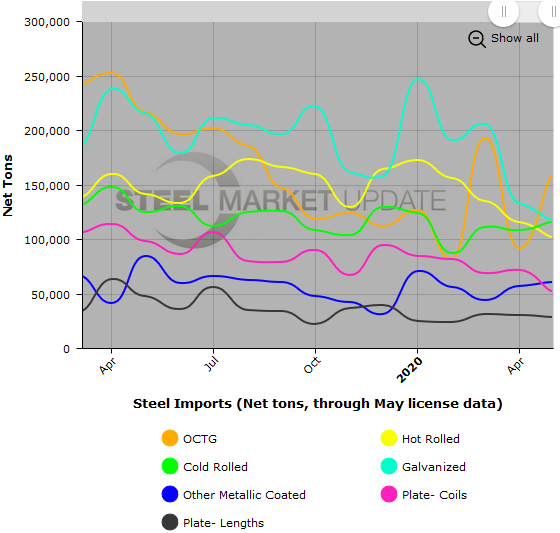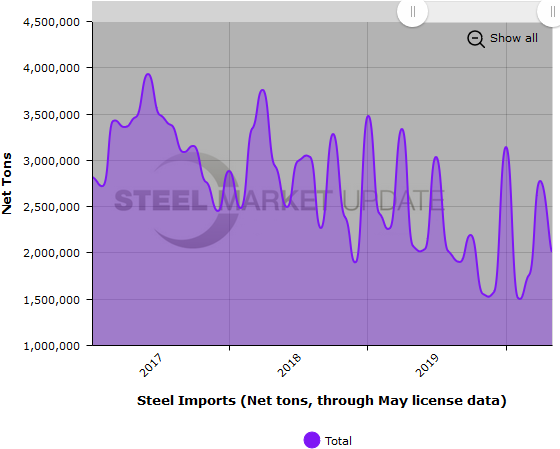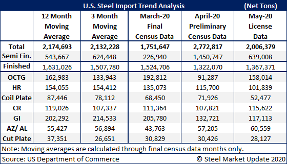 Recently updated license data shows preliminary April steel imports were 2.77 million net tons, according to the U.S. Department of Commerce. This is a downward adjustment of 200,000 tons compared to the license data reported last week.