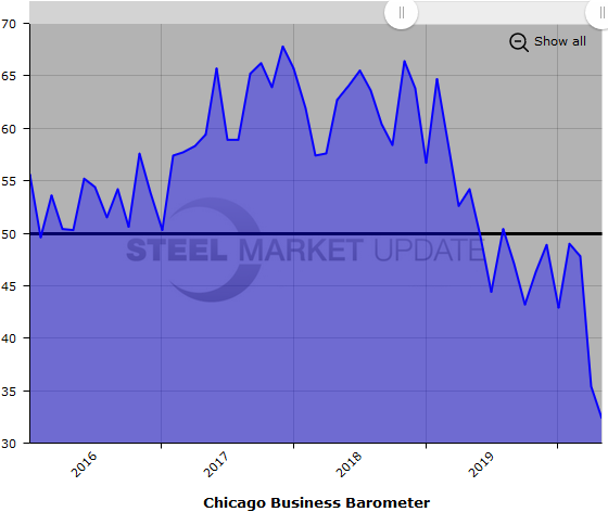Below is a graph showing the history of the Chicago Business Barometer. You will need to view the graph on our website to use its interactive features; you can do so by clicking here. If you need assistance logging in to or navigating the website, please contact us at info@SteelMarketUpdate.com.