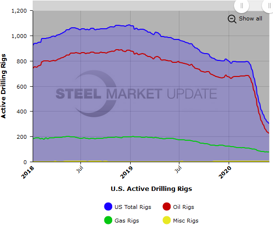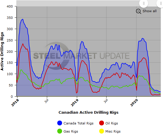Active U.S. and Canadian drill rigs declined yet again this past week, according to oilfield services company Baker Hughes. The active drill rigs count is important to the steel industry because it is a leading indicator of oil country tubular goods demand.
