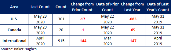 The number of active U.S. rigs fell by 17 to 301, with oil rigs down 15, gas rigs down 2, and miscellaneous rigs unchanged. Compared to this time last year, the 301 count is down 683 rigs, with oil rigs down 578, gas rigs down 107, and miscellaneous rigs up 2. See the first graph below for a history of active U.S. rig counts.