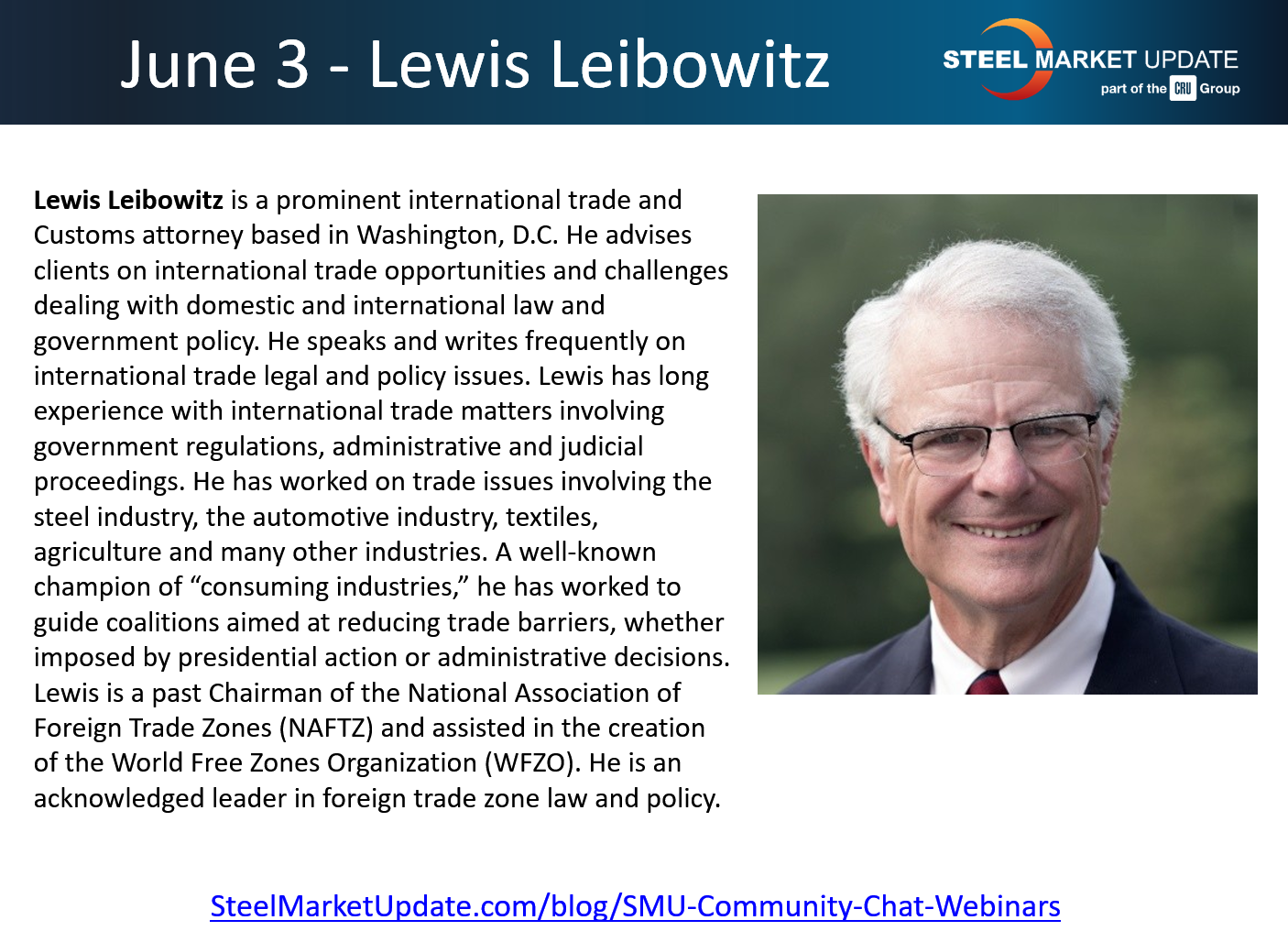 A regular contributor to Steel Market Update, Leibowitz is an expert on government regulation and international trade. He’ll be ready to answer listeners’ questions on the Section 232 tariffs and the controversial exclusion process, trade with China, the impact of the new USMCA agreement, and the implications of the COVID-19 pandemic on the global economy and international relations, among other topics.
