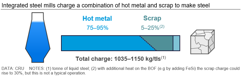 The key inputs into a BOF-based steelmaking process are hot metal (i.e. iron) and steel scrap. In more typical conditions, to adjust to weaker demand, steelmakers can adjust steel output by reducing the utilization of their operating BFs and/or by changing the scrap rate in the BOF. Steelmakers will balance relative costs of hot metal production and scrap in their operations in doing so, though sustaining output at the BF will be a priority and in the first instance they will lower scrap rates. During a demand shock, the low operational flexibility of a BF creates an initial period of oversupply.