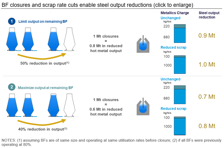The graphic below quantifies the supply cuts of an integrated mill operating with 2 BFs; with BOF scrap rates minimized, we estimate that a reduction in steel output of ~1 Mt can be achieved for every 1 Mt of idled BF capacity.