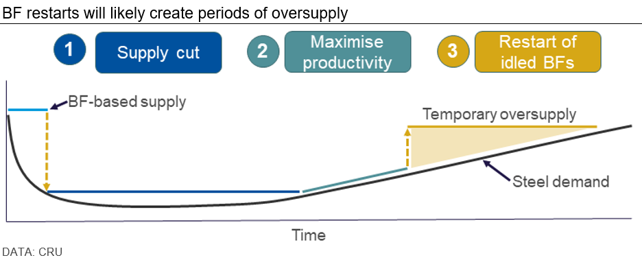 As steel markets recover from the pandemic-induced downturn, idled BFs will be restarted and there is a significant risk of periods of oversupply. Initially, steel producers can increase the productivity of the operating BFs and the BOF, but eventually they will need to restart idled BFs to service increased demand. As blast furnaces cannot restart gradually, this supply will likely exceed available demand, which CRU expects to stay weak in 2020 and recover more gradually. Many market participants are expecting the first BF restarts to begin in late-2020 Q3 and 2020 Q4, creating a risk of temporary oversupply and low prices in this period.