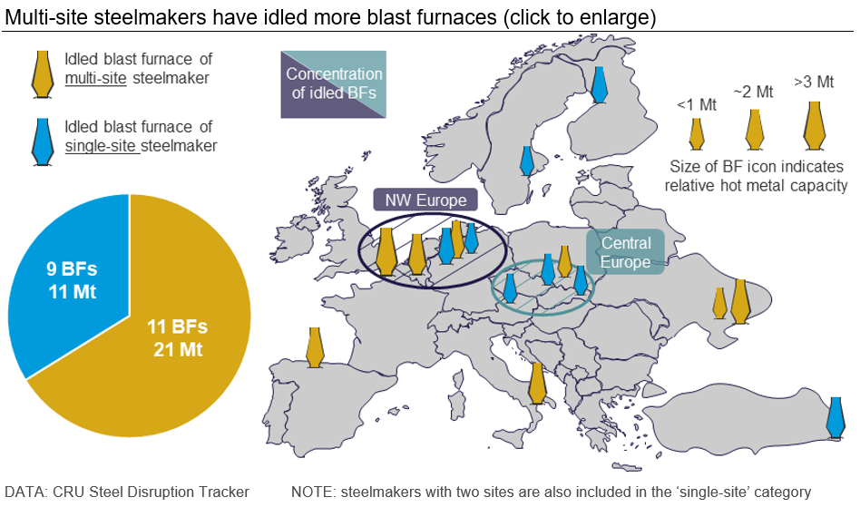 It is challenging for BF-based steel operations to adjust production dynamically to demand because of the operational inflexibility of the BF. Once closures take place, the restart of BFs creates the risk of a period of potential oversupply as demand will not typically recover quickly enough to absorb all the material produced at the minimum technical utilization of the BF. Our view is that steelmakers are unlikely to wait until order books are filled sufficiently to sustainably restart idled BFs. If demand begins to exceed their available supply without a BF restart, this risks a loss of market share, either to other domestic producers or imports. In Europe, most idled BFs belong to multi-site steelmakers and so can be better managed, but we believe that restarted BFs from single-site producers will be enough to tip the scales of the European steel market. This will lead to oversupply, and excess volume will likely be sold as semi-finished or finished steel at low prices.