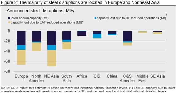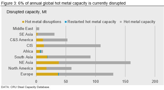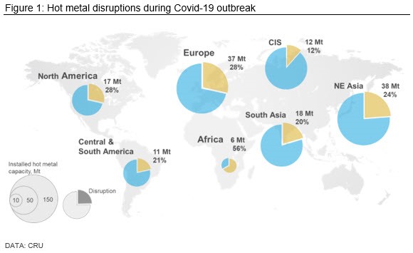 The spread of Covid-19 has resulted in an annualized loss of 284 Mt of steel capacity outside China. Slowly easing lockdown measures in most regions have allowed for the resumption of some industrial activities and steel producers in some countries are restarting their operations, while others have been forced to make further curtailments.