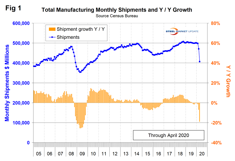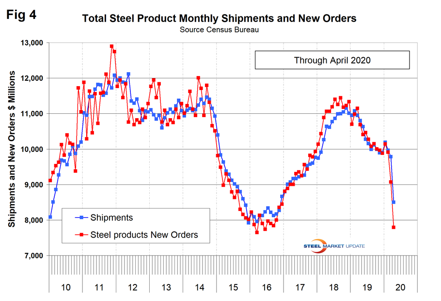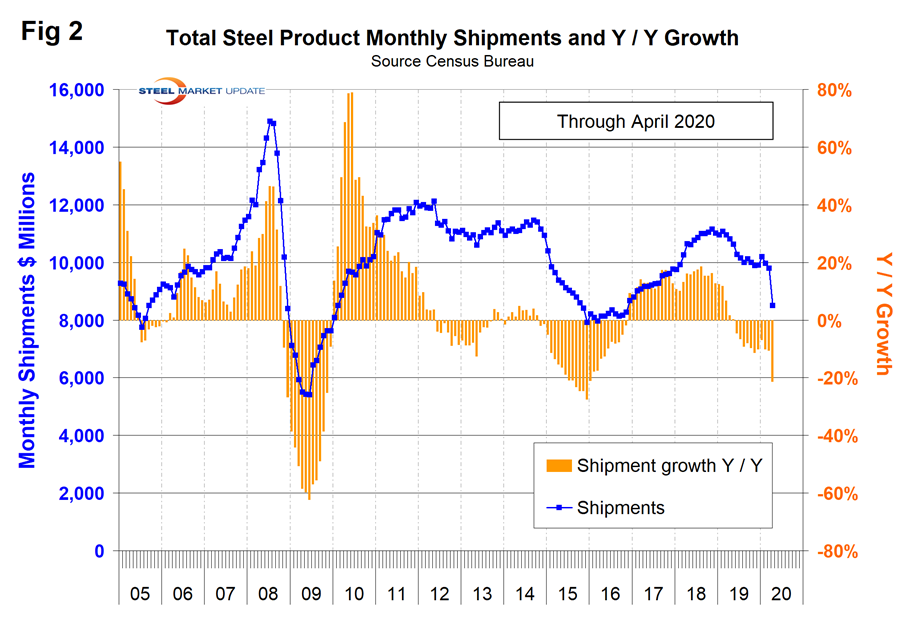 Census Bureau results for April were released on June 3. Figure 2 shows monthly steel product shipments in millions of dollars with the year-over-year growth through April. Shipments of steel products had a recent peak in November 2018 with the beginning of the pandemic decline evident in April. The year-over-year growth rate has declined from 18.6 percent in August 2018 to negative 21.3 percent in April 2020. The Census Bureau defines shipments as follows: “Manufacturers’ shipments measure the dollar value of products sold by manufacturing establishments and are based on net selling values, f.o.b. (free on board) plant, after discounts and allowances are excluded. Freight charges and excise taxes are excluded. Multi-industry companies report value information for each industry category as if it were a separate economic unit. Thus, products transferred from one plant to another are valued at their full economic value.”