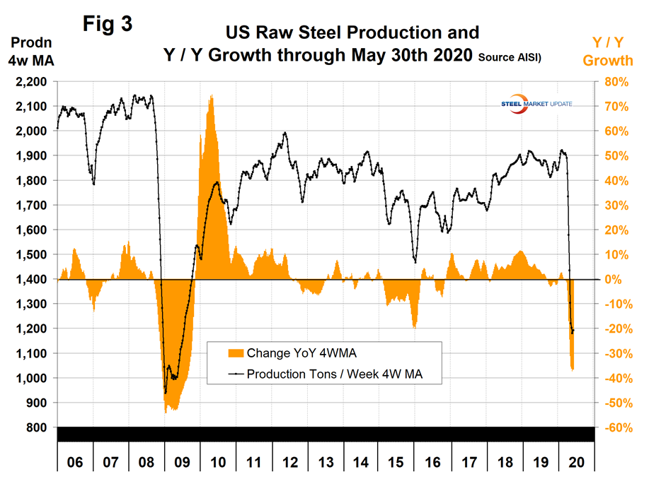 In our SMU reports, we aim to provide information on the same subject from different sources. The data in Figure 2 compares well over the long term with the AISI weekly crude steel production shown in Figure 3, which is four weeks more current than the Census data. Figure 2 is in dollars and Figure 3 is in tons, but the shape of the curves is comparable. The AISI weekly tonnage had a recent bottom in the week ending Oct. 5 last year on a four-week moving average basis as shown in Figure 3 and is current as of May 30.