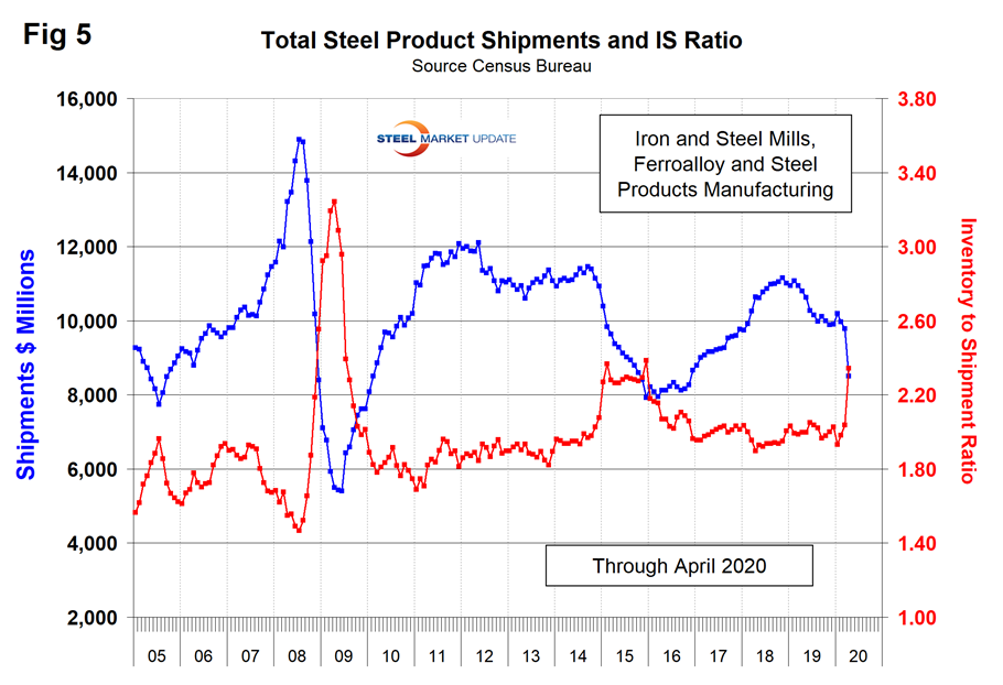 Figure 5 shows the same total shipment line as Figure 2 but now includes the inventory-to-shipment ratio. The IS ratio shot up in April as shipments declined.