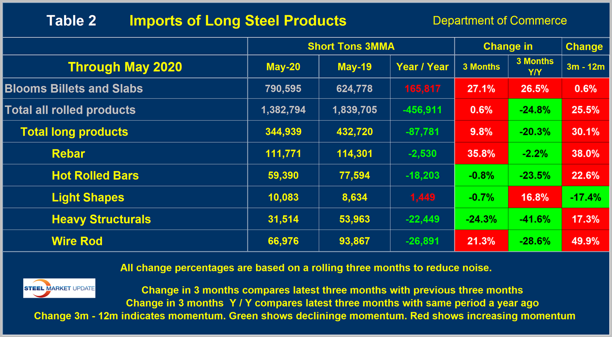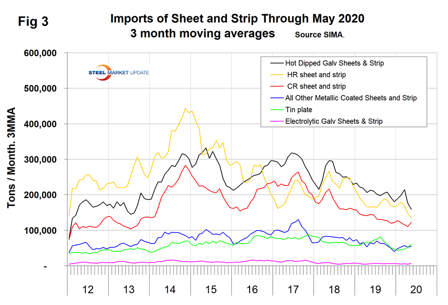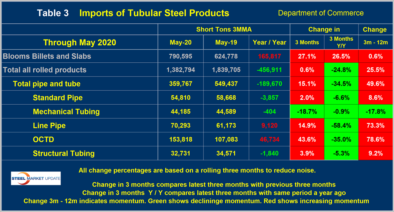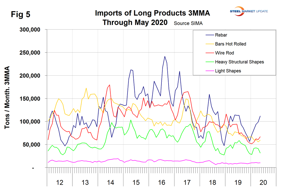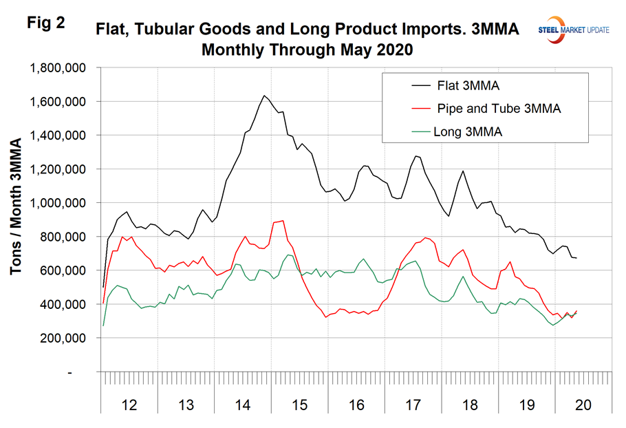 Imports of total rolled products in May were 1.458 million tons on a single-month basis, up from 1.243 million in April. In the 13 months August 2018 through August 2019, total rolled product imports on a 3MMA basis were consistently in the range of 1.70 to 1.94 million tons. In the months September 2019 through May 2020, the new normal has been a range of 1.25 to 1.56 million tons with May at the top of this range. Year over year on a 3MMA basis, sheet products were down by 16.8 percent, plate products were down by 35.8 percent, long products were down by 20.3 percent and tubulars were down by 34.5 percent. Imports of flat rolled, tubulars and longs all had a recent peak in May 2018.