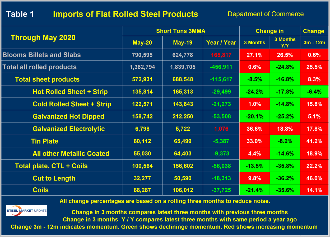 Imports of rolled products through May, year over year, were not affected by the pandemic, but the longer-term decline continued, according to the latest Commerce Department data.