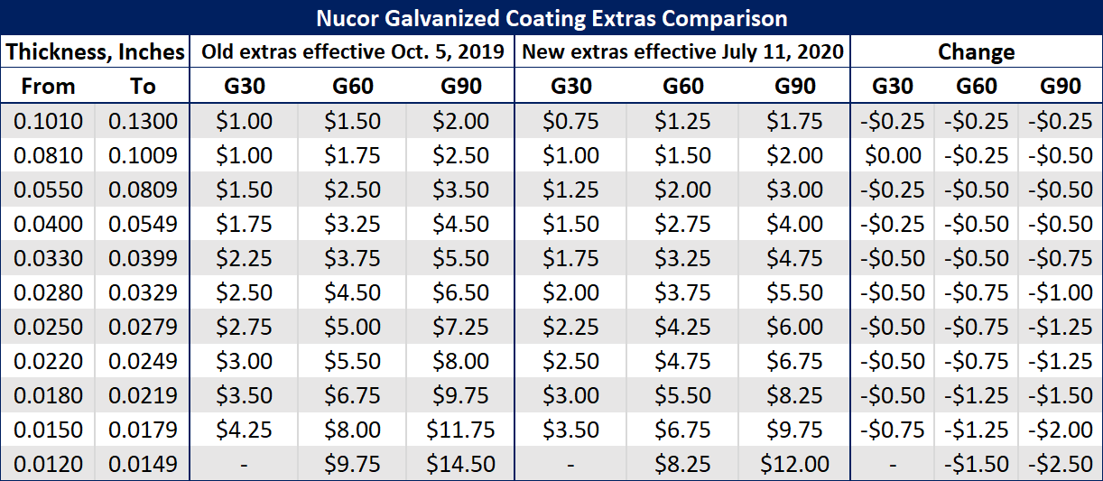 SMU has done an analysis on the old and new Nucor galvanized extras, provided below. Nucor extras declined by an average of 16 percent.