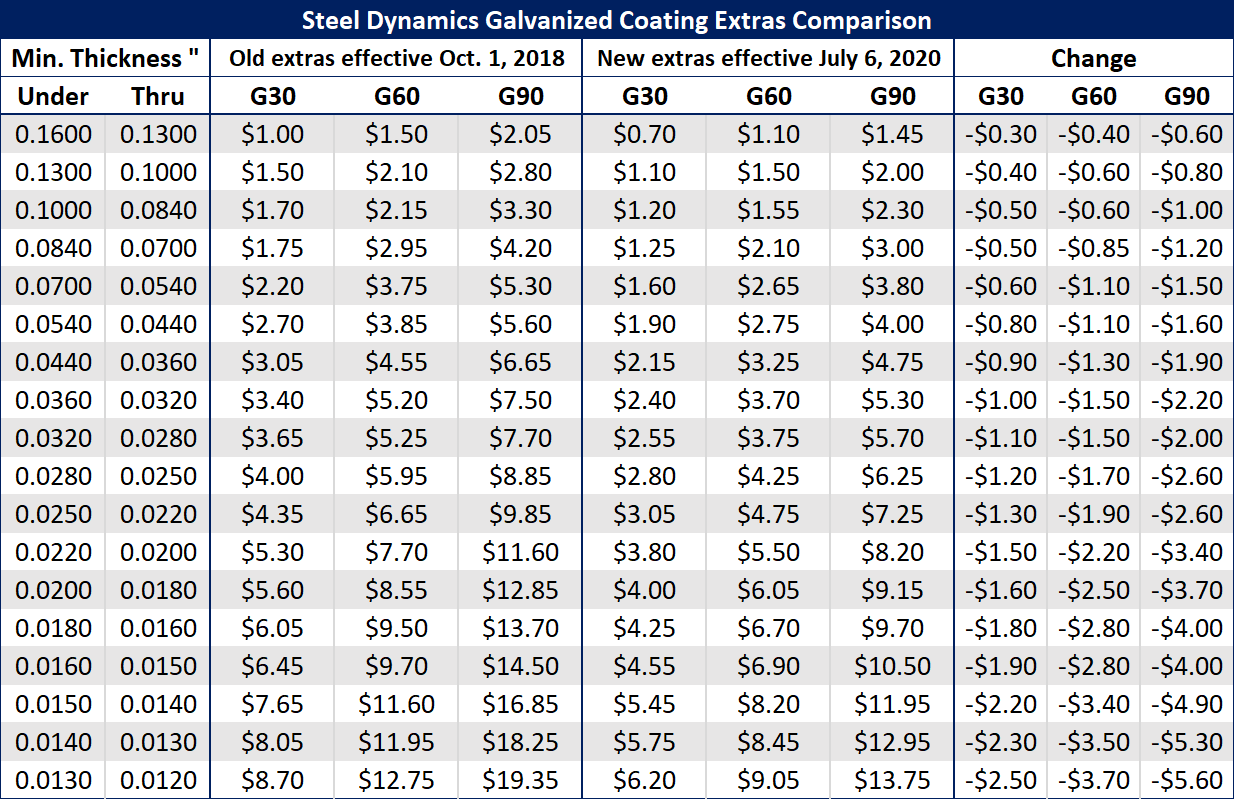 The comparison below shows old and new Steel Dynamics galvanized extras, which declined by an average of 29 percent.