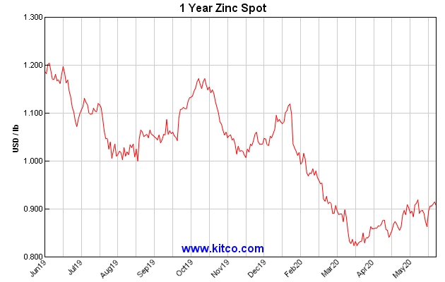 Zinc prices declined significantly during the first quarter of the year, dropping from January’s high of $1.1186 to a low of $0.8236 in March. The current price for zinc is about $0.9112 per pound according to Kitco.