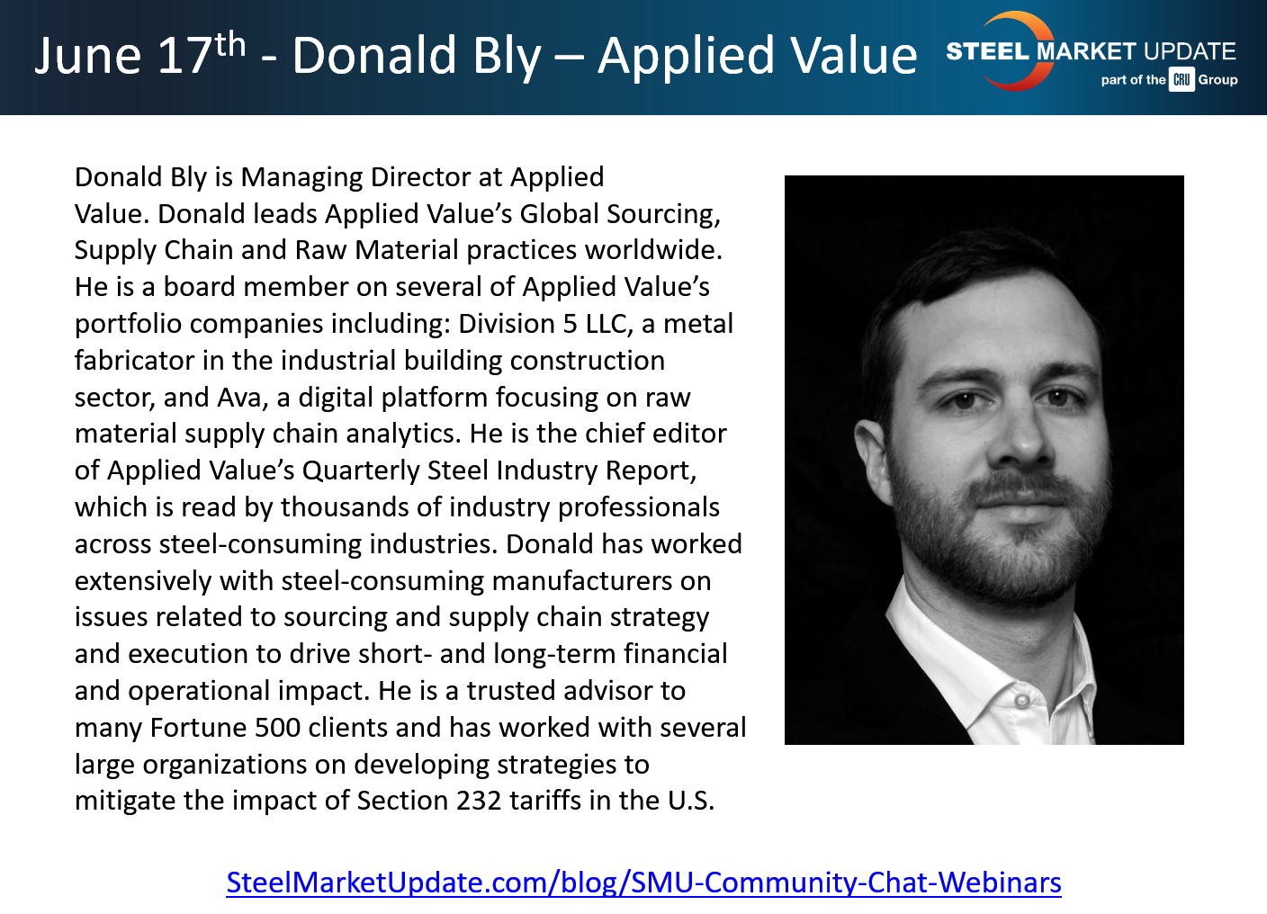 On Wednesday, June 10, we will host our next SMU Community Chat webinar with our guest speaker Donald Bly, managing director of Applied Value.