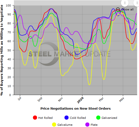 In the cold rolled segment, 74 percent reported the mills willing to talk price, up from 67 percent at the end of May.