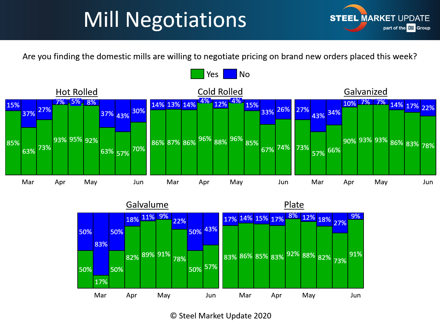 In galvanized, 78 percent reported the mills open to price negotiation this week, down slightly from 83 percent in SMU’s last canvass of the market. More than half, about 57 percent of the respondents, have found the mills willing to compromise on Galvalume prices, as well.