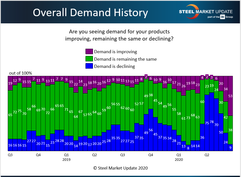 The majority of steel buyers (53 percent) responding to Steel Market update’s market trends questionnaire this past week said they are seeing improvement in demand for their products. Another 38 percent reported that demand is the same/stable. Just 9 percent said they are still seeing declines in demand from their customers—a dramatic turnaround from April when more than 75 percent were suffering from a shocking loss of orders.