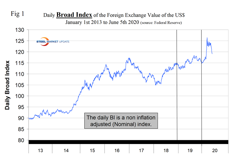 Explanation of data sources: The Broad Index is published by the Federal Reserve on both a daily and monthly basis. It is a weighted average of the foreign exchange values of the U.S. dollar against the currencies of a large group of major U.S. trading partners. The index weights, which change over time, are derived from U.S. export shares and from U.S. and foreign import shares. The data are noon buying rates in New York for cable transfers payable in the listed currencies. At SMU we use the historical exchange rates published in the Oanda Forex trading platform to track the currency value of the U.S. dollar against that of 16 steel trading nations. Oanda operates within the guidelines of six major regulatory authorities around the world and provides access to over 70 currency pairs. Approximately $4 trillion U.S. dollars are traded every day on foreign exchange markets.