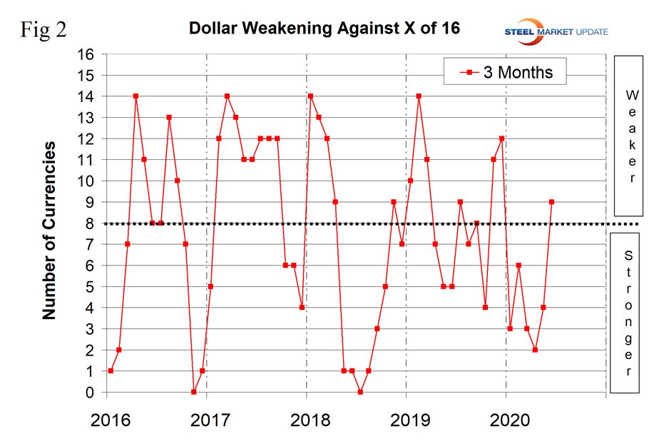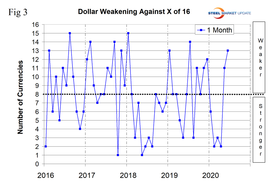 The currencies of the steel and raw materials trading nations were much more volatile in the 30 days prior to June 14 than they were in the same period leading up to our May 18 report. At Steel Market Update, we track the currencies of these 16 nations on a daily basis and report monthly. Table 1 shows the number of currency units that it takes to buy one U.S. dollar and the percentage change in the last year, three months, one month and seven days. The overall picture for the steel trading nations is that in the last year the picture hasn’t changed much, but in three months and 30 days the dollar has become increasingly weaker. Table 1 is color coded to indicate weakening of the dollar in green and strengthening in red. We regard strengthening of the U.S. dollar as negative and weakening as positive because of the effect on net imports. Figures 2 and 3 show the extreme gyrations that have occurred at the three-month and one-month levels in the last four years.