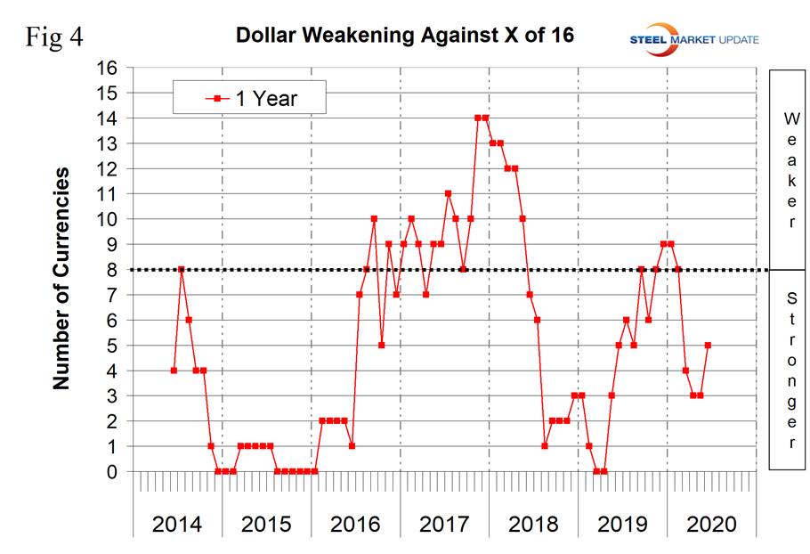 Figure 4 shows the 12-month picture, which removes some of the volatility by showing the number of currencies against which the dollar was weakening on a year-over-year basis. In March and April 2019, the dollar strengthened against all 16 at the 12-month level. There was a progressive weakening until December 2019 and January 2020 when the dollar weakened against nine of the 16. In the 12 months leading up to mid-June 2020, another reversal had occurred by which time the dollar was weakening against five. A strengthening dollar puts downward pressure on globally traded raw materials prices.