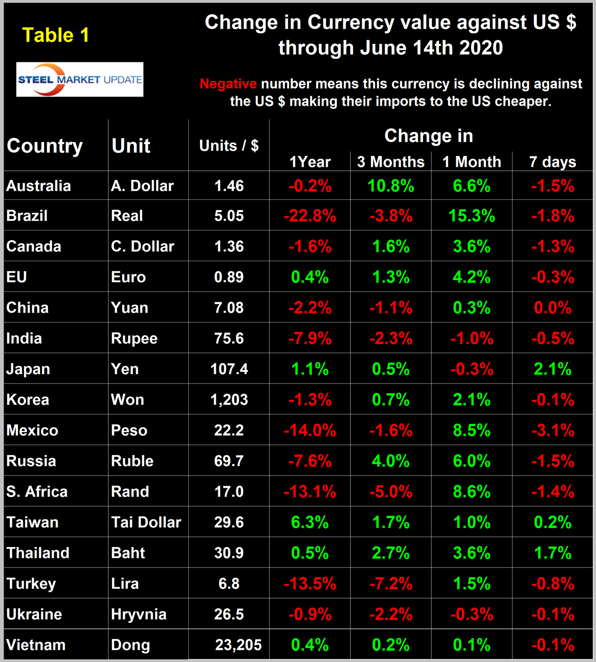 In this report we examine the change in currency values of the 16 preeminent global steel and iron ore trading nations. The currencies of these 16 don’t necessarily follow the Broad Index value of the U.S, dollar, but in the last three months have done so. The latest value of the Broad Index as published by the Federal Reserve was June 5, on which date the dollar was down by 3.5 percent in three months and by 2.8 percent in 30 days. Our country data from Oanda was current as of June 14.