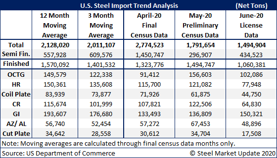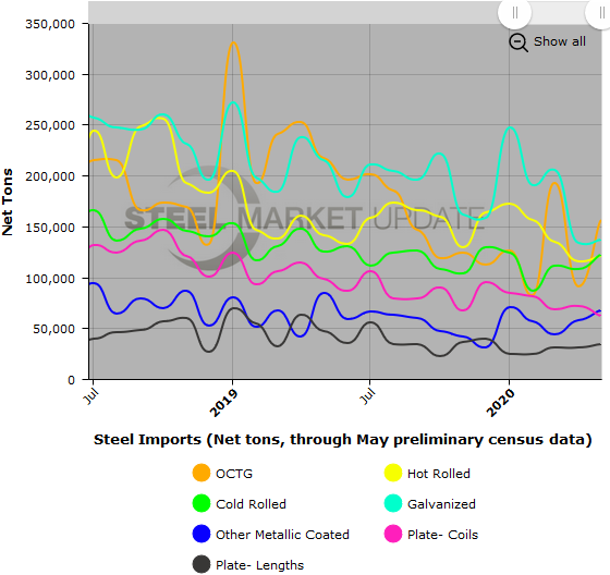 The three graphics below show total steel imports through May preliminary census data. To provide the most clarity, we are only showing a limited time line in each graphic. To see a greater data history and utilize our interactive graphing features, you can visit our website. Contact us at info@SteelMarketUpdate.com if you have any questions.
