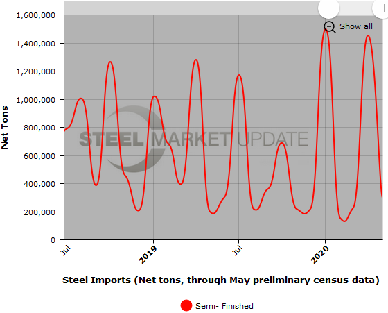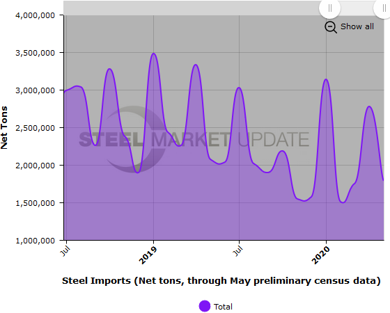 Recently released preliminary steel import data shows May imports totaling 1.79 million net tons, according to the U.S. Department of Commerce. This is down nearly 1 million tons compared to final April imports, primarily due to the quarterly reset on semifinished imports.