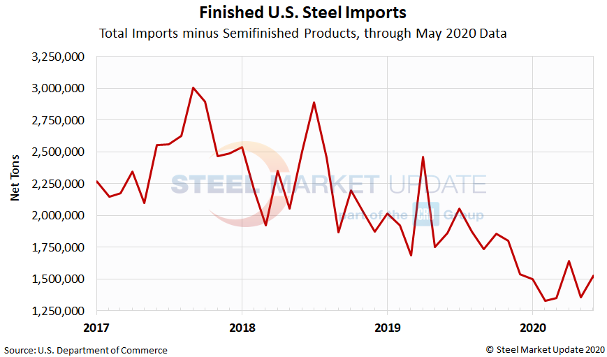Taking semifinished products out of the picture, imports of finished products are up in May over the previous month; 1.49 million tons of finished imports are reported to have been imported, up nearly 13 percent or 171,000 tons over April figures.
