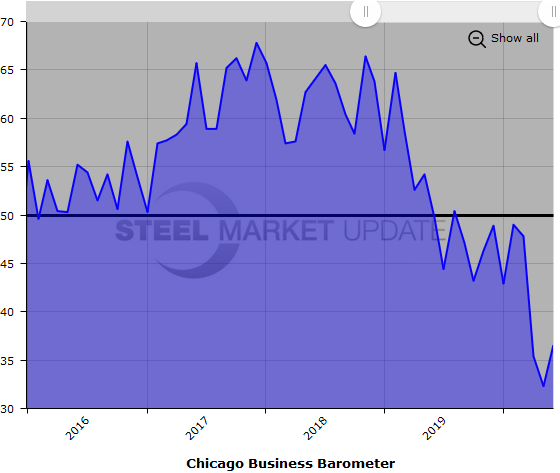 Below is a graph showing the history of the Chicago Business Barometer. You will need to view the graph on our website to use its interactive features; you can do so by clicking here. If you need assistance logging into or navigating the website, please contact us at info@SteelMarketUpdate.com.