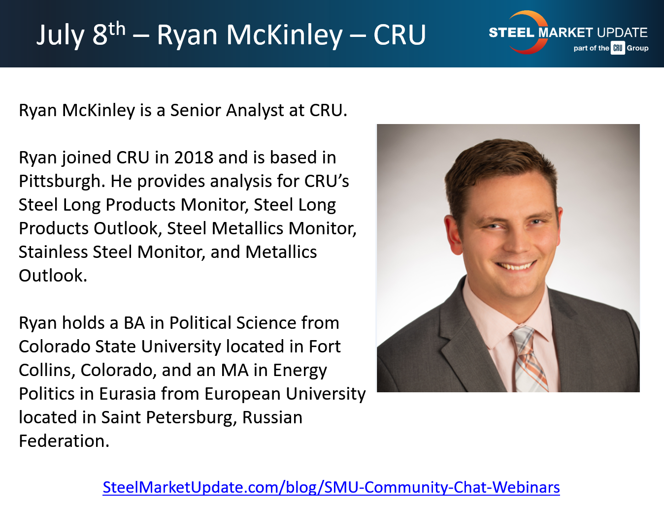 Steel Market Update’s next Community Chat webinar on Wednesday, July 8, will host CRU Senior Analyst Ryan McKinley, who will offer an update on the global ferrous scrap market and answer metallics-related questions from listeners.