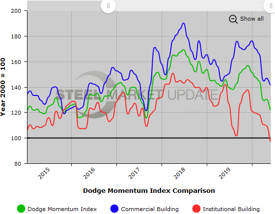 Below is a graph showing the history of the Dodge Momentum Index. You will need to view the graph on our website to use its interactive features; you can do so by clicking here. If you need assistance logging in to or navigating the website, please contact us at info@SteelMarketUpdate.com.