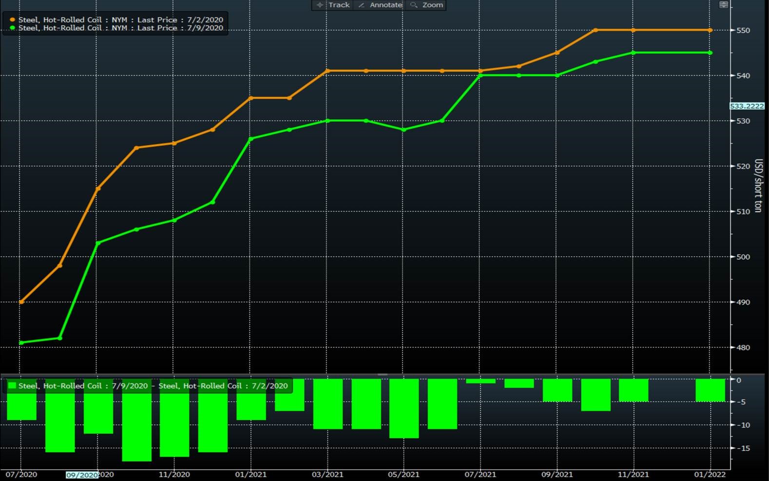 The past week has been a rough one for HRC futures. The potential for scrap to weaken more than expected, and negative developments related to COVID-19, have caused sellers to become more aggressive in the markets. You can see that week on week futures have dropped across the curve out into 2021: