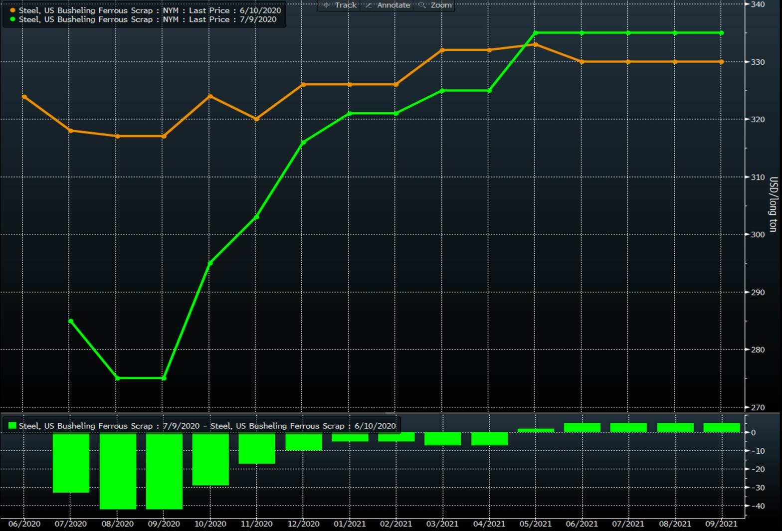The scrap market has been part of the catalyst. Consensus expectations a month ago were perhaps for a flattish to down $10 on busheling. Two to three weeks ago scrap market participants were thinking down $20-30. This week sentiment has worsened further, causing a significant drop in the curve versus one month ago: