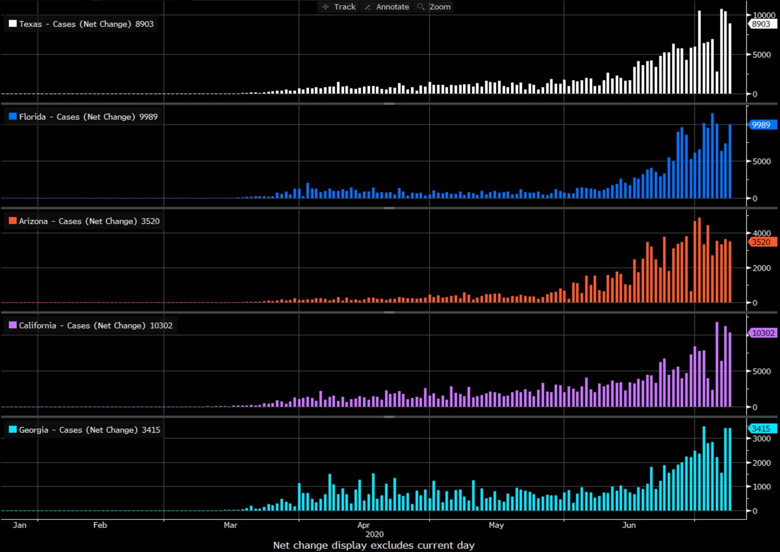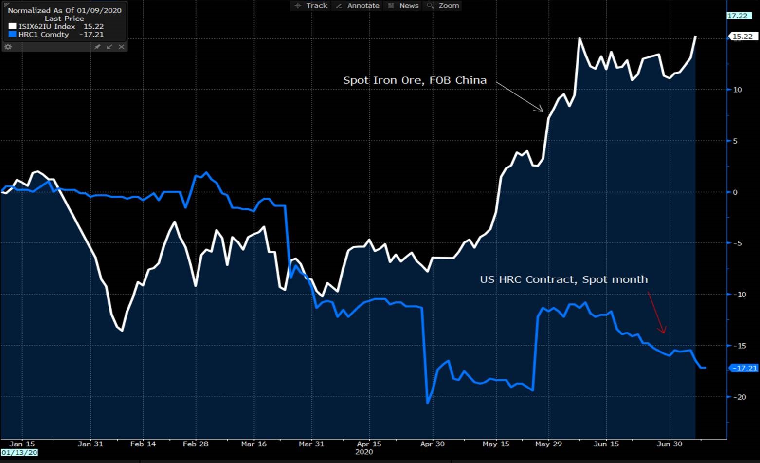 The other factor worth mentioning is the surge in virus cases in a number of states here in the U.S. This has caused traders to question how much we will need to “tap the brakes” on reopening the economy—and may be causing some steel demand jitters:
