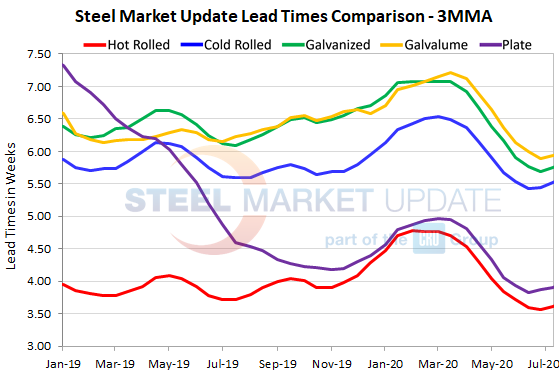 Looking at three-month moving averages, which smooth out the variability in the biweekly readings, lead times have trended downward since the coronavirus struck and are about a week shorter than prior to the pandemic. This week, however, the 3MMAs for all the flat rolled products showed a small uptick for the first time since March. The current 3MMA for hot rolled is 3.61 weeks, cold rolled is 5.51 weeks, galvanized is 5.75 weeks, Galvalume is 5.93 weeks and plate is 3.91 weeks.
