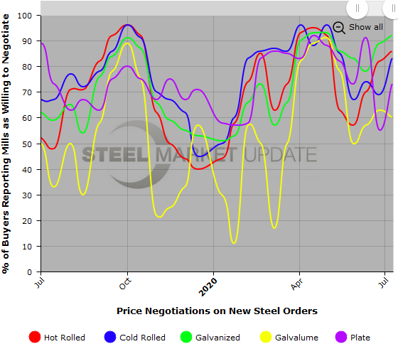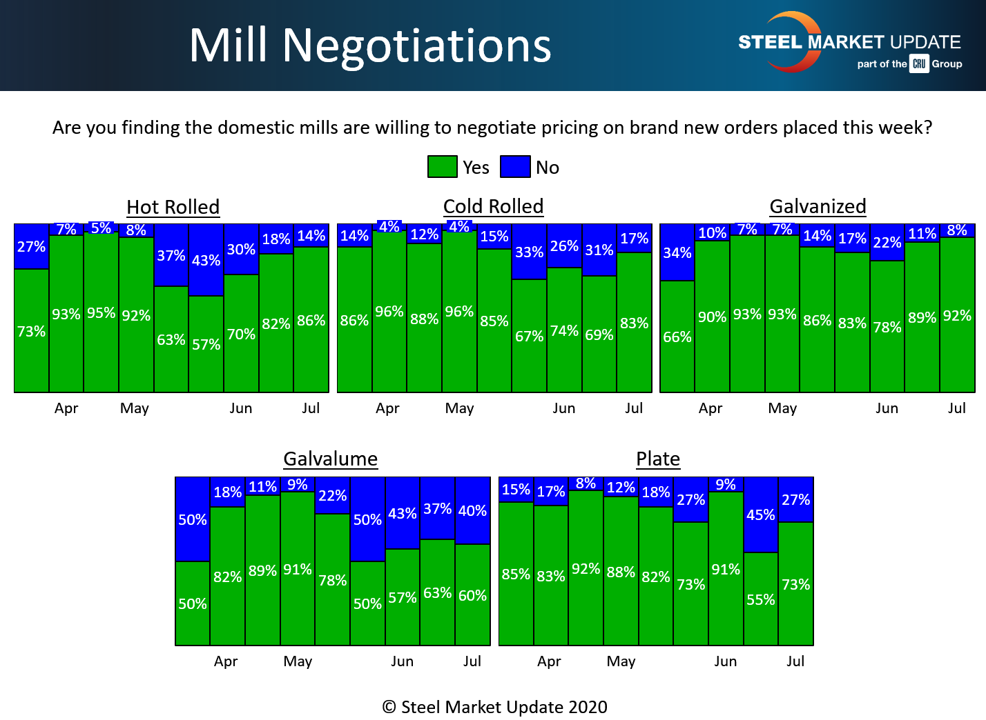 The vast majority of steel buyers responding to Steel Market Update’s market trends questionnaire this week report that mills are willing to compromise on price to win orders as the economy and steel demand continue to battle the effects of the coronavirus crisis.