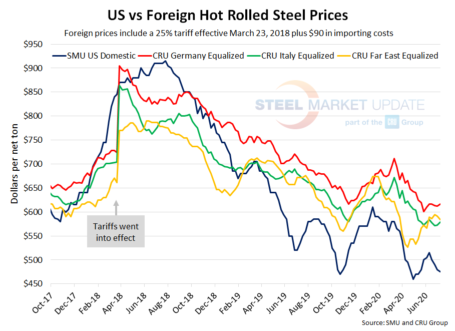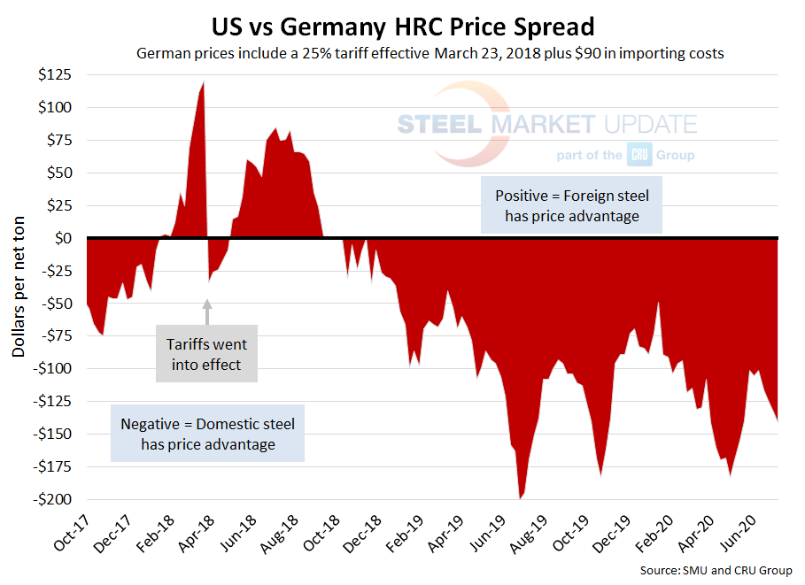 As of Wednesday, July 8, the CRU German HRC price was $421 per net ton, up $3 over the previous week and up $2 from two weeks prior. Adding tariffs and import costs, that puts the German price at $616 per ton delivered to the U.S. The latest SMU hot rolled price average is $475 per ton, down $5 over last week and down $15 over two weeks prior. Therefore, domestically sourced HRC is theoretically $141 per ton cheaper than imported German HRC; the spread was $133 last week and $124 two weeks ago. U.S. prices have held this price advantage for over a year and a half.